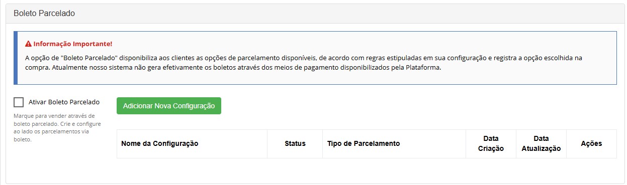 - Para ativar a ferramenta marque a caixa de seleção Ativar Boleto Parcelado