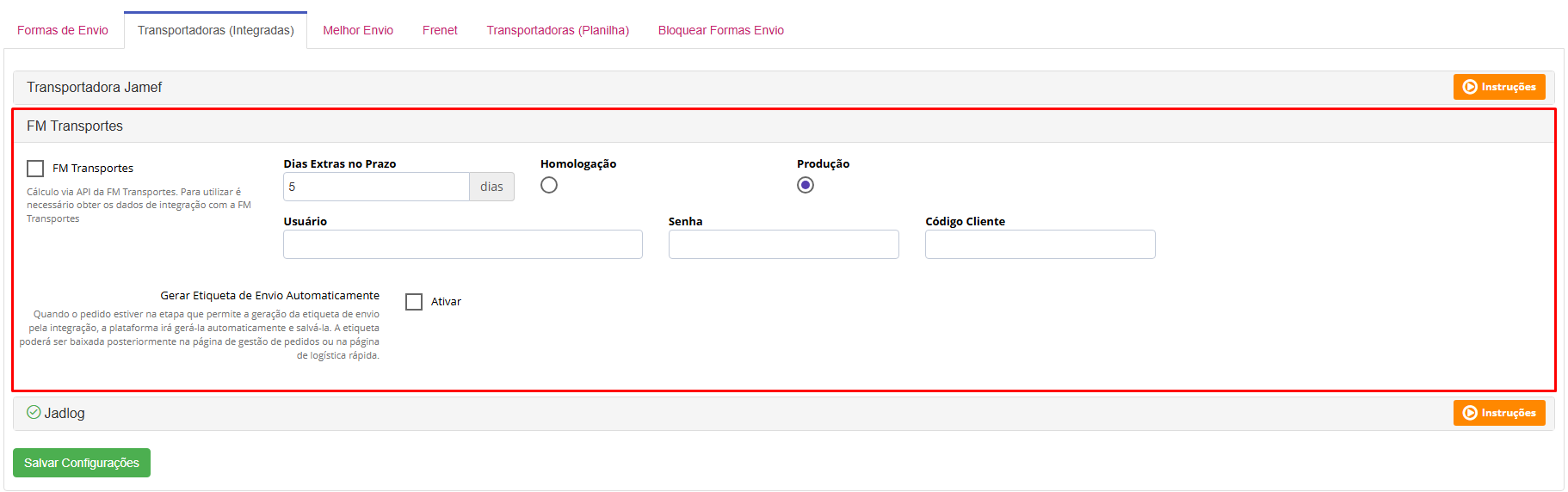 Nesta tela o lojista pode configurar a forma de envio pela FM Transportes.