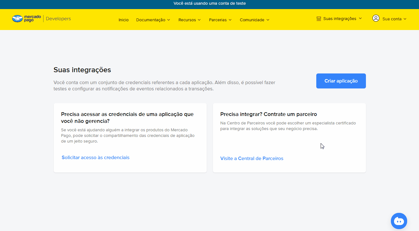 - 1° Passo – Primeiro é necessário criar uma aplicação dentro do painel do Mercado Pago. Para isso, acesse este link.