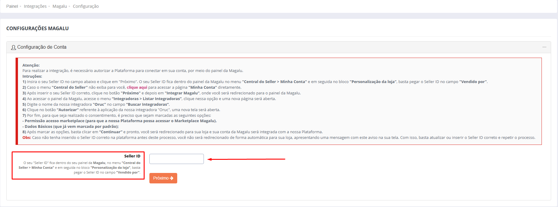 - Insira o seu SELLER ID e depois clique em PRÓXIMO