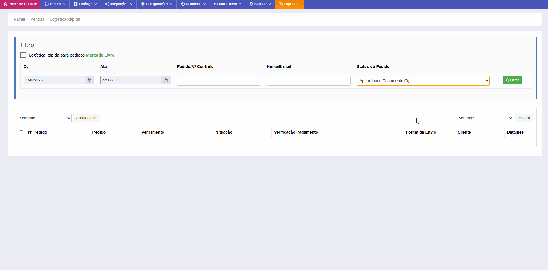 - Caso seja um pedido via Melhor Envio, Correios (Contrato com Sigep) ou Jadlog e deseja imprimir a etiqueta por dentro do painel da Oruc. Ainda na tela de logística rápida é necessário que o pedido esteja no status de SEPARAÇÃO – IMPRIMIR ETIQUETA ou EM ENTREGA, se o pedido estiver no status de SEPARAÇÃO – INFORMAR RASTREIOS, PAGAMENTO CONFIRMADO ou AGUARDANDO PAGAMENTO não é possível emitir a etiqueta.
